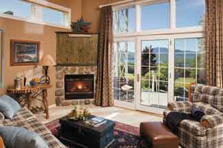 of a Ralph Lauren ad — stone fireplaces, woven rugs, warm bookshelves, exposed wood, comfy couches.
