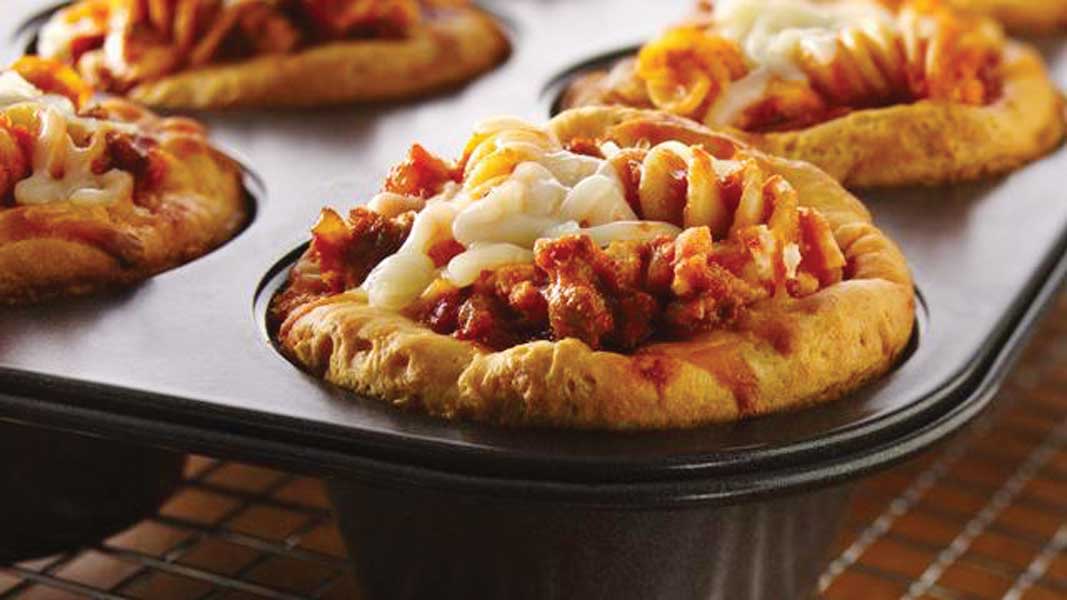 Bake 10 minutes. Sprinkle evenly with French-fried onions. Bake 15 to 20 minutes longer or until toothpick inserted in center comes out clean and tops are golden brown. Cool 5 minutes. With thin knife, loosen sides of pies from pan, remove from pan and place top side up on cooling rack. Cool 10 minutes longer before serving.