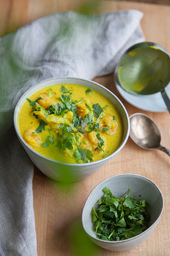 Ithaca has been carrying on a hot love affair with elegant Thai cuisine for almost 30 years. It's inspired some of our most popular dishes, but we attempt to emulate Thai-style dishes with great humility. This simple, naturally vegan and gluten-free chowder features classic ingredients like potatoes and sweet corn, but simmered with coconut milk, fresh ginger and aromatic Thai basil, and sparked with jalapeño. This soup is good without the cilantro or mint garnishes, but with them, it's divine.