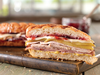 Arrange ham, roast pork, cheese and chiles on the mustard halves of each sandwich, then top with the jam halves.